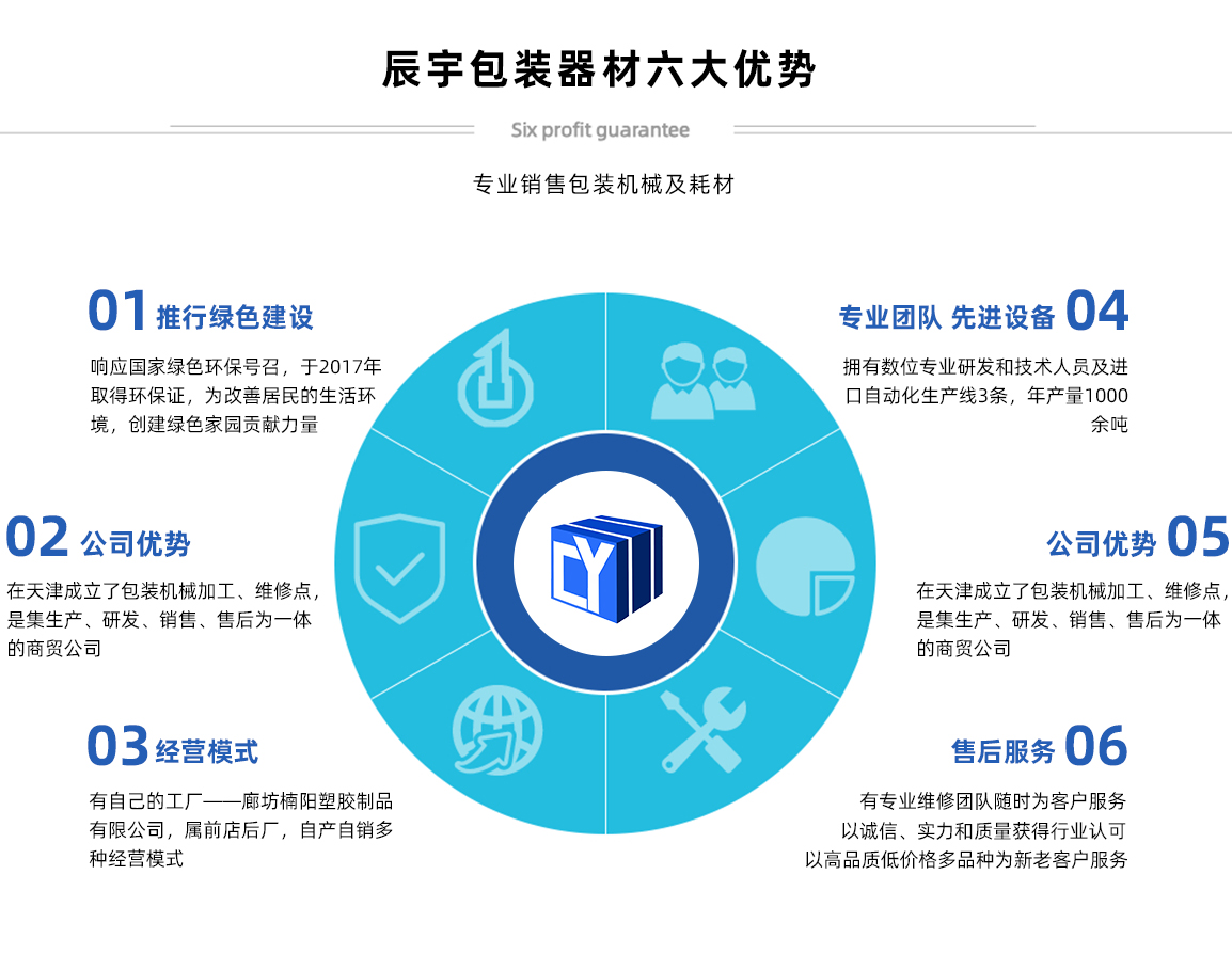 天津辰宇包裝器材有限公司原天津市辰宇商貿(mào)有限公司,位于天津市南開(kāi)區(qū)密云一支路新南馬路五金城二區(qū)33棟106號(hào),本公司主要經(jīng)營(yíng):打包帶,打包機(jī)系列,封箱機(jī)系列,纏繞機(jī)系列,拉伸膜,膠帶,尼龍繩,其他包裝耗材等產(chǎn)品 公司產(chǎn)品質(zhì)優(yōu)價(jià)廉,暢銷(xiāo)全國(guó)各大城市。同等質(zhì)量比價(jià)格,同等價(jià)格比質(zhì)量,我們確保質(zhì)量,價(jià)錢(qián)合理,交貨迅速及時(shí)。公司始終秉承“精益求精,鑄造品質(zhì)的典范”的經(jīng)營(yíng)理念,真誠(chéng)為廣大客戶(hù)提供真誠(chéng)的服務(wù)! 天津市辰宇包裝器材有限公司,感謝廣大新老客戶(hù)的鼎力支持,竭誠(chéng)歡迎社會(huì)各界朋友前來(lái)洽談業(yè)務(wù),愿真誠(chéng)合作攜手共創(chuàng)美好未來(lái)!